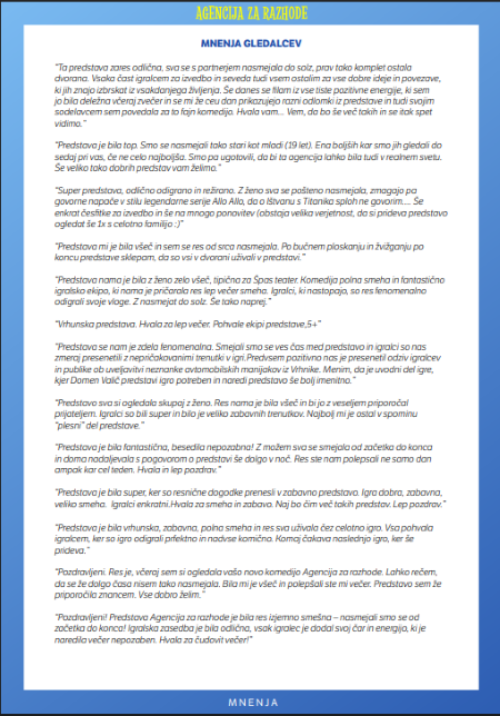 V 28 letih smo doživeli v Špas teatru že ogromno, a tako pozitivnega odziva GLEDALK in GLEDALCEV, kot ga prejema nova komedija AGENCIJA ZA RAZHODE, še nismo imeli!