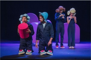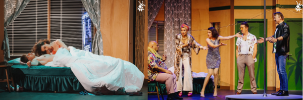 Komedija POSLI POD KRINKO. Levo: sveže zaljubljena Lea Mihevc in Matej Zemljič, desno: mafijski šef Big Mac, ki mu plesalki pojasnjujeta, kaj vse se je dogajalo v njegovem nočnem klubu.